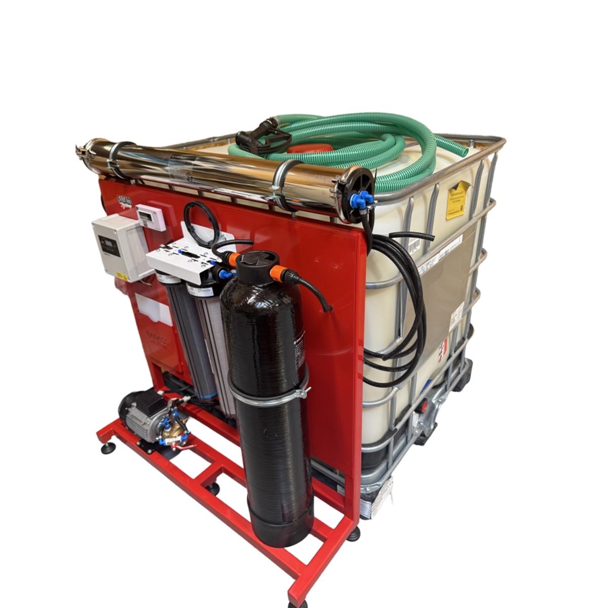Dit Badass Static System is volledig automatisch en doet alles voor u, vullen, stoppen, spoelen...Het enige wat u moet doen is het water met de bijgeleverde krachtige hydrofoorpomp overpompen naar uw voertuig en u kunt gaan werken.Het systeem is voorzien van:* Overzichtelijk bedieningspaneel* Makkelijk toegangkelijke filters* Stevig rood gepoederlakt frame met regelbare voeten* 20" sediment filter* 20" carbonblock filter* 4040 fijnmembraan* 25L harsfles* Spring Autofill/flush controller* 220v Boosterpomp* Elektronische vlotter* TDS meter* Manometer* Naaldregelaar* 1000L nieuwe IBC container * 25m 1" verstevigde vul slang* Vulpistool